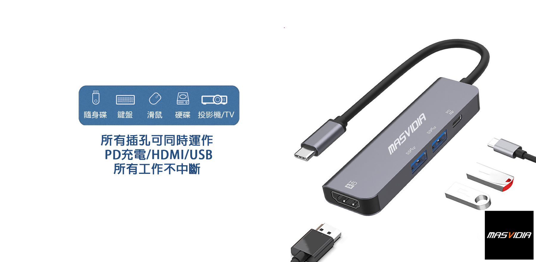 MasVidia USB Type C 4合1 多功能轉接器 USB3.0 PD充電集線器 HDMI轉接頭