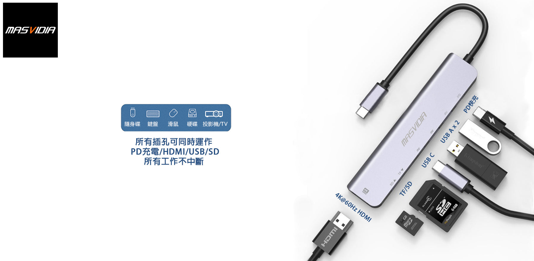 MasVidia USB Type C 7合1 高速多功能轉接器 PD充電傳輸集線器 HDMI轉接頭