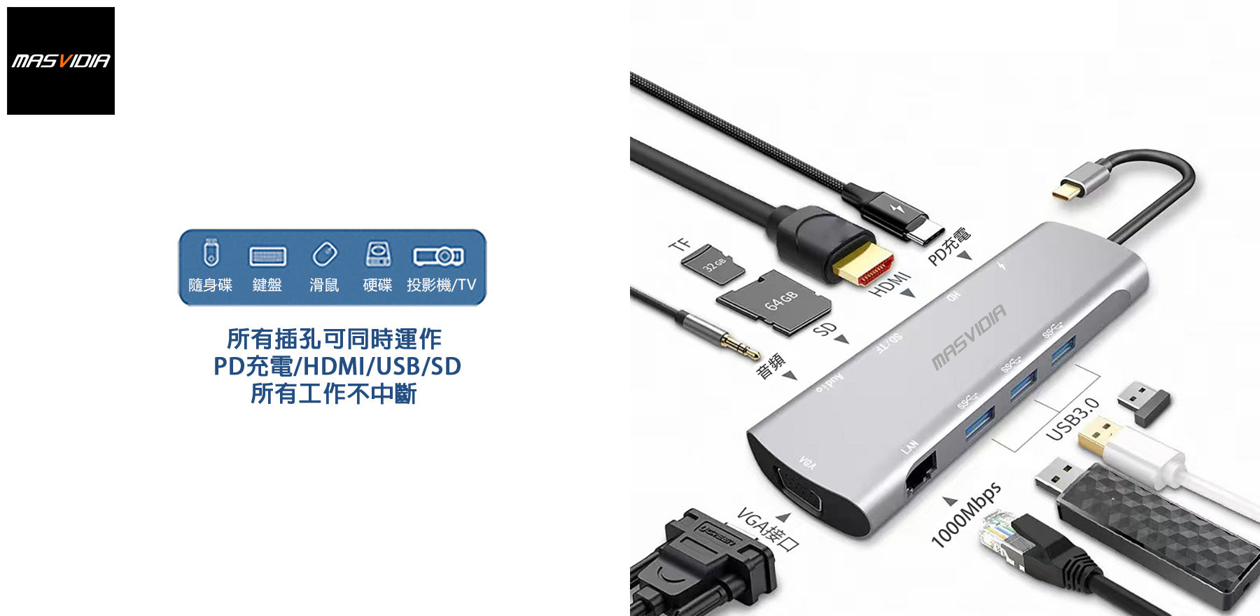 MasVidia USB Type C 10合1 多功能轉接器 USB3.0 PD充電集線器 HDMI轉接頭